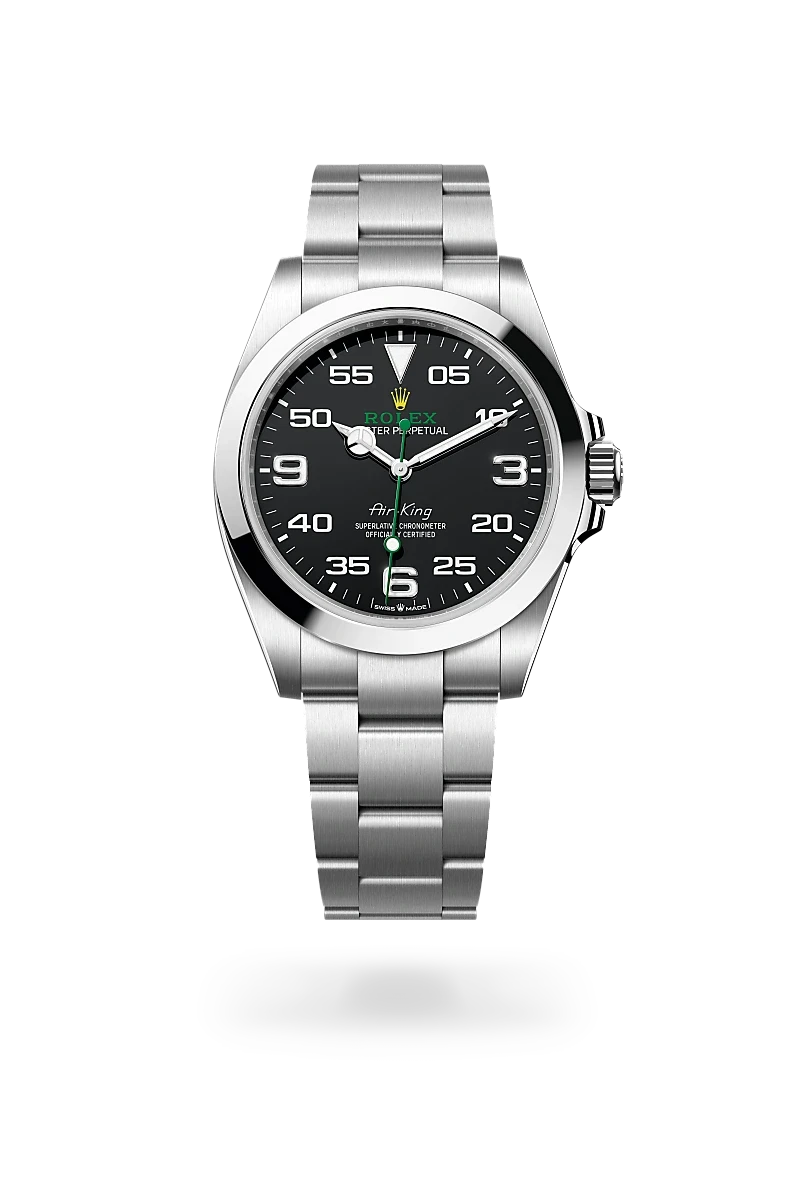 The Air-King dial features a distinctive black dial with a combination of large 3, 6 and 9 numerals marking the hours and a prominent minute scale for navigational time readings. It bears the name Air-King in the same lettering that was designed specially for the model in the 1950s.
