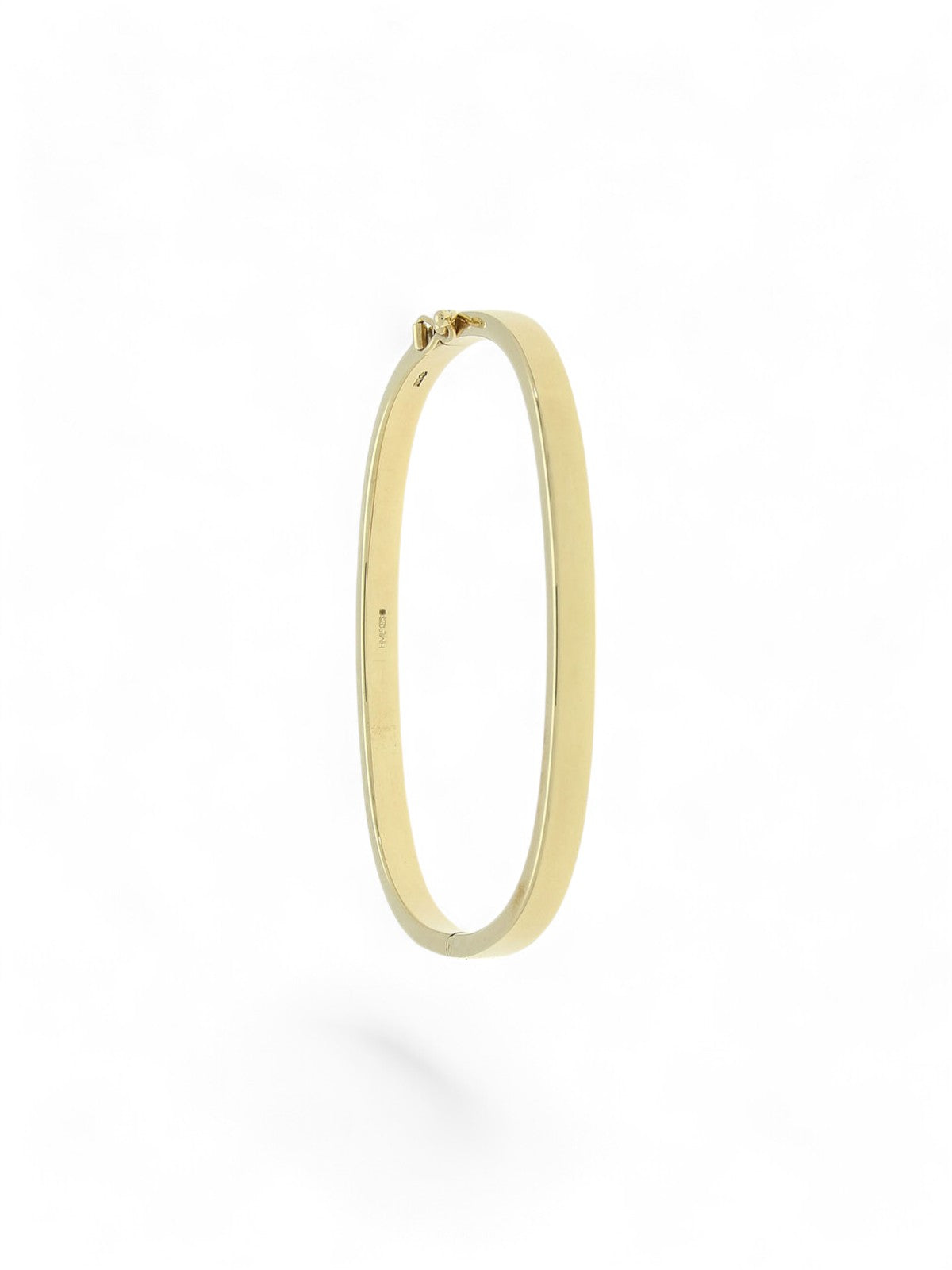 Crafted from 9ct yellow gold, this 4mm solid bangle showcases a square shaped outline and is available to buy online or at our Eastbourne, East Sussex jewellers.