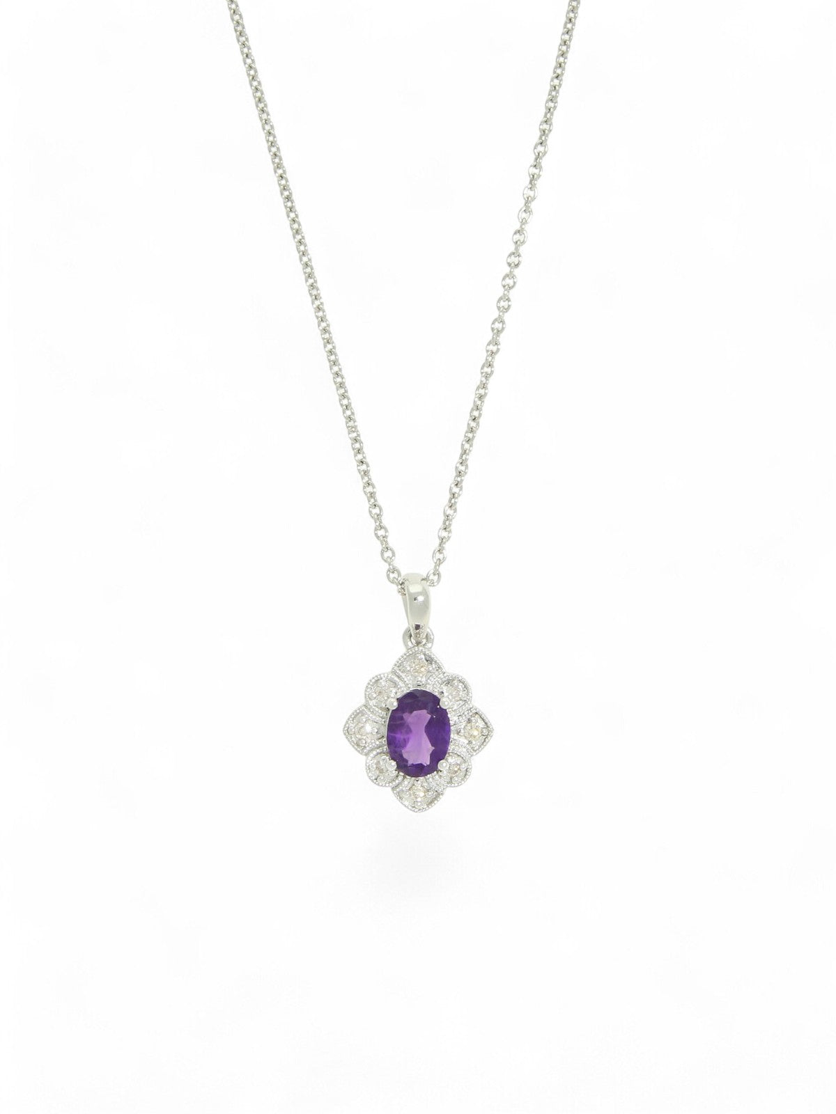 Amethyst & Diamond Art Deco Floral Pendant Necklace in 9ct White Gold