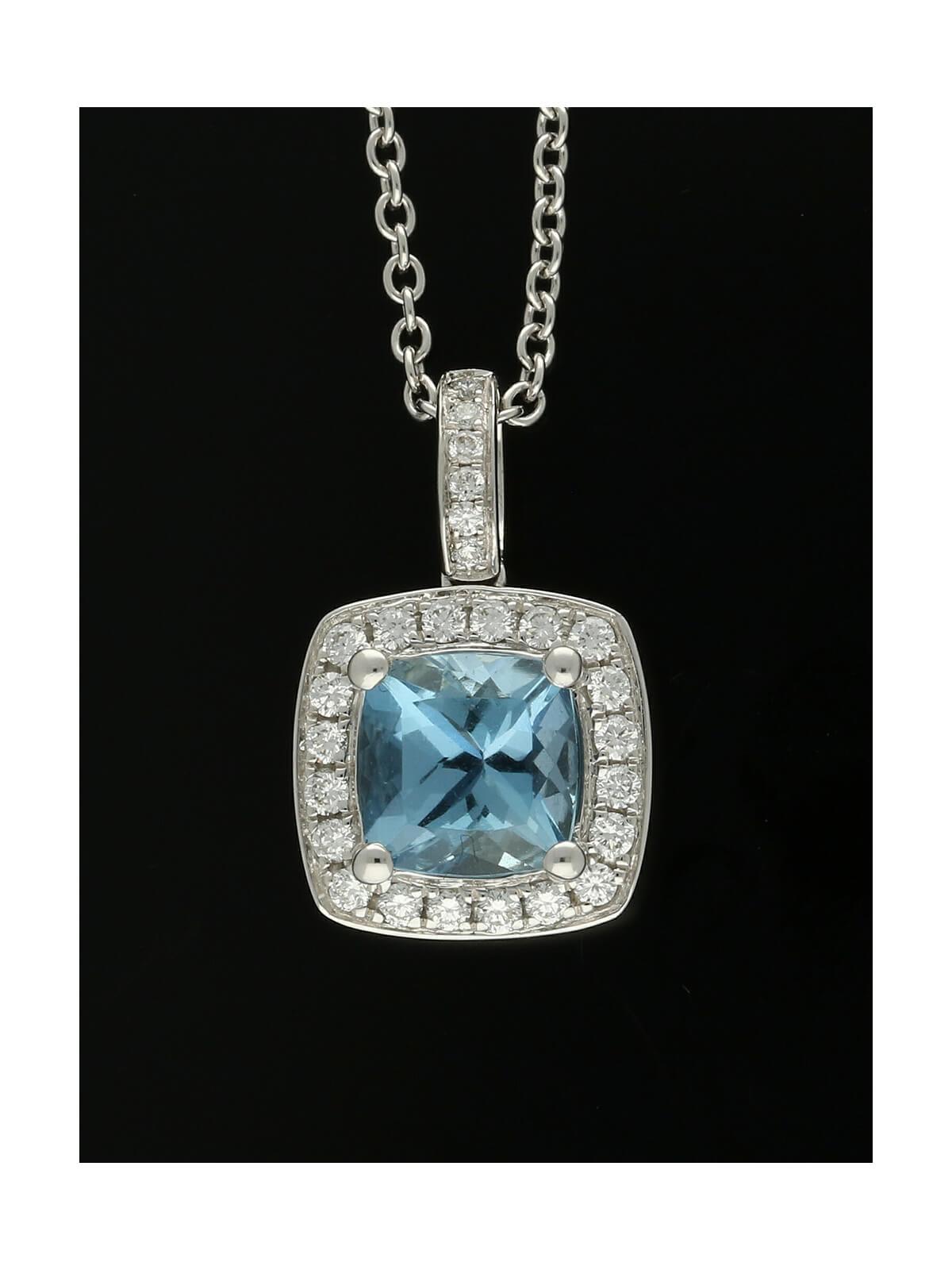 Aquamarine & Diamond Cushion Cluster Pendant Necklace in 18ct White Gold
