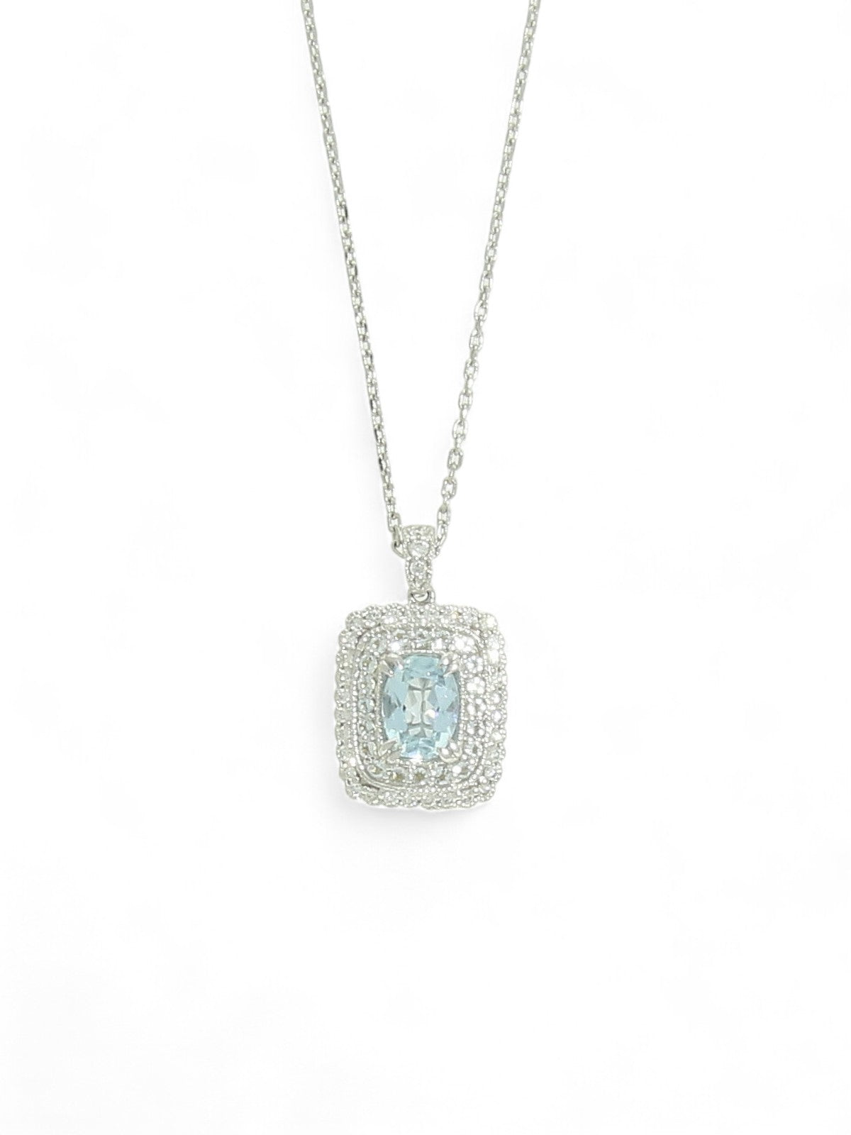 Aquamarine & Diamond Oval Cut Halo Fancy Rectangular Pendant Necklace in 18ct White Gold