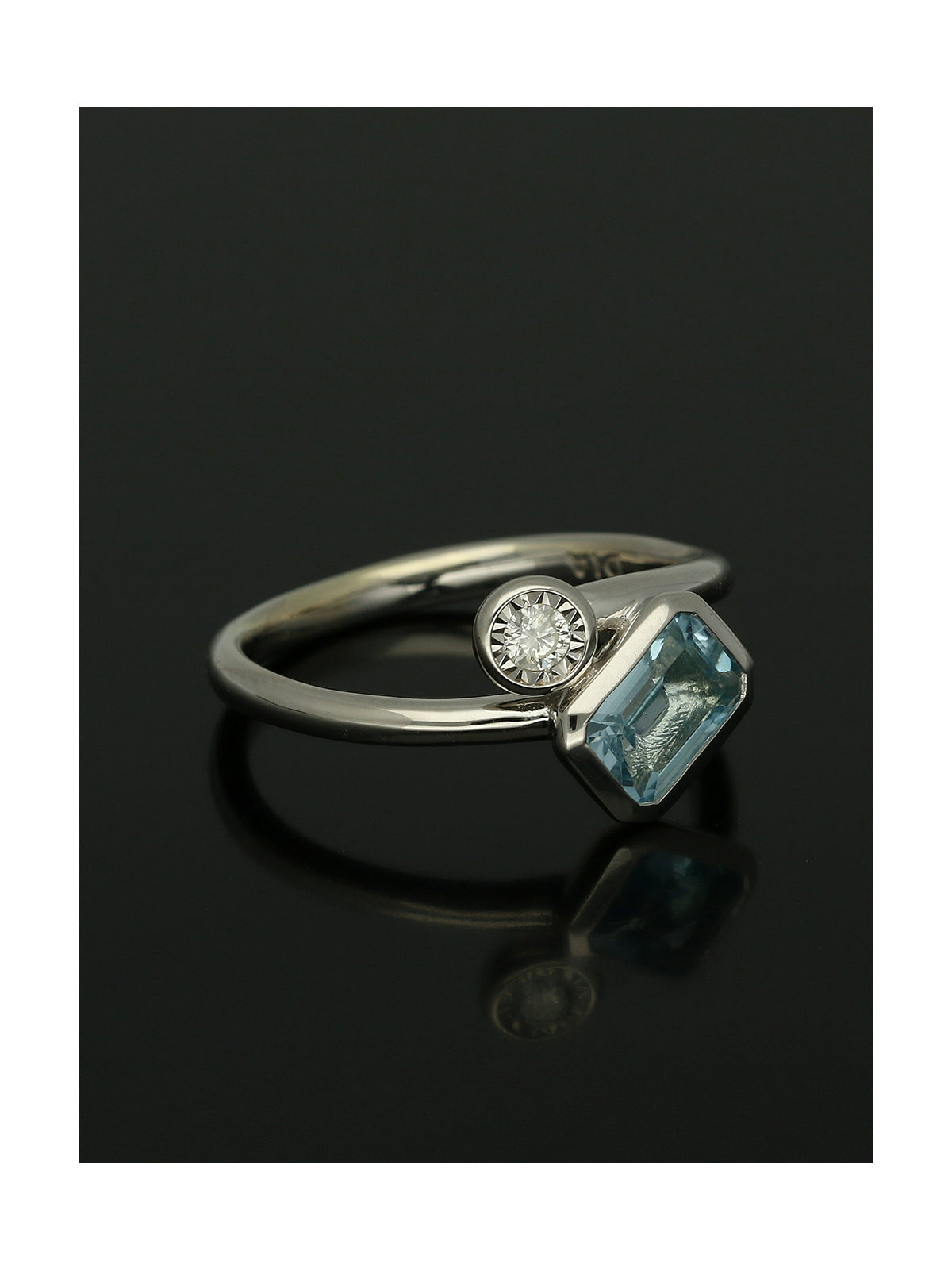 Lovingly crafted from 9ct white gold, this dress ring showcases an emerald cut blue topaz gemstone in a bezel setting and a round brilliant cut diamond in an illusion setting. Available to buy online or at our Eastbourne, East Sussex store.