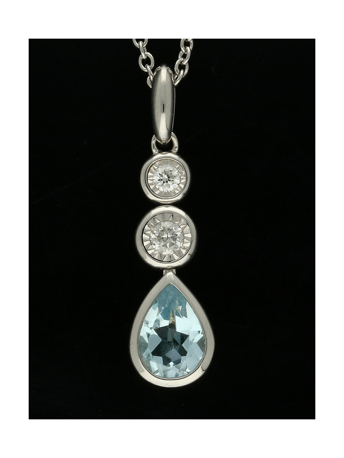 Blue Topaz & Diamond Three Stone Drop Pendant Necklace in 9ct White Gold