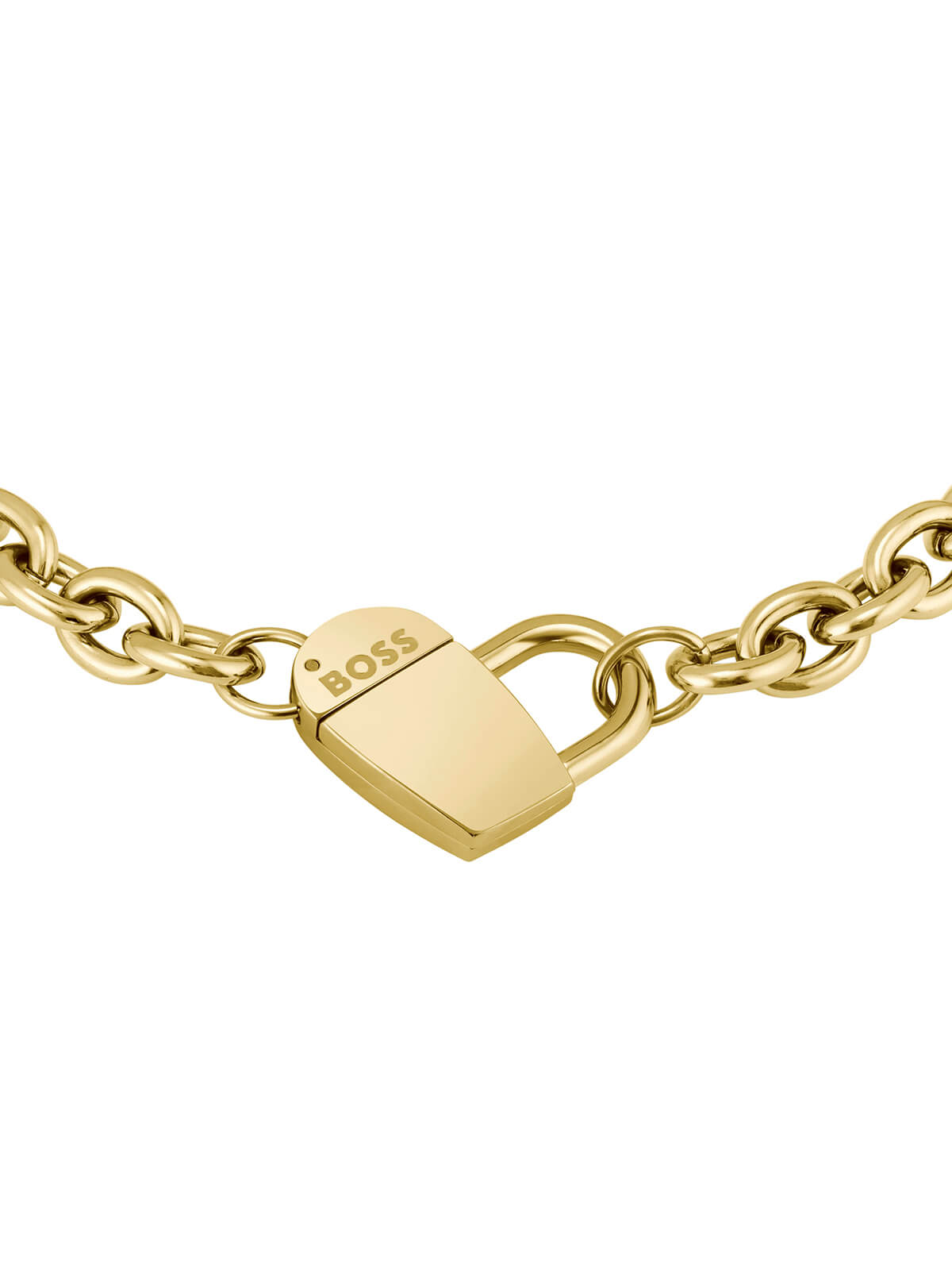 Available to buy online or at our Eastbourne jewellers, this BOSS Dinya bracelet is crafted from gold plated stainless steel and features a padlock-inspired heart pendant at its centre. The heart, which is reversible, is stamped with the brand's signature "B" monogram on the front, and etched with the BOSS logo on the reverse. This key element also functions as a magnetic closure.