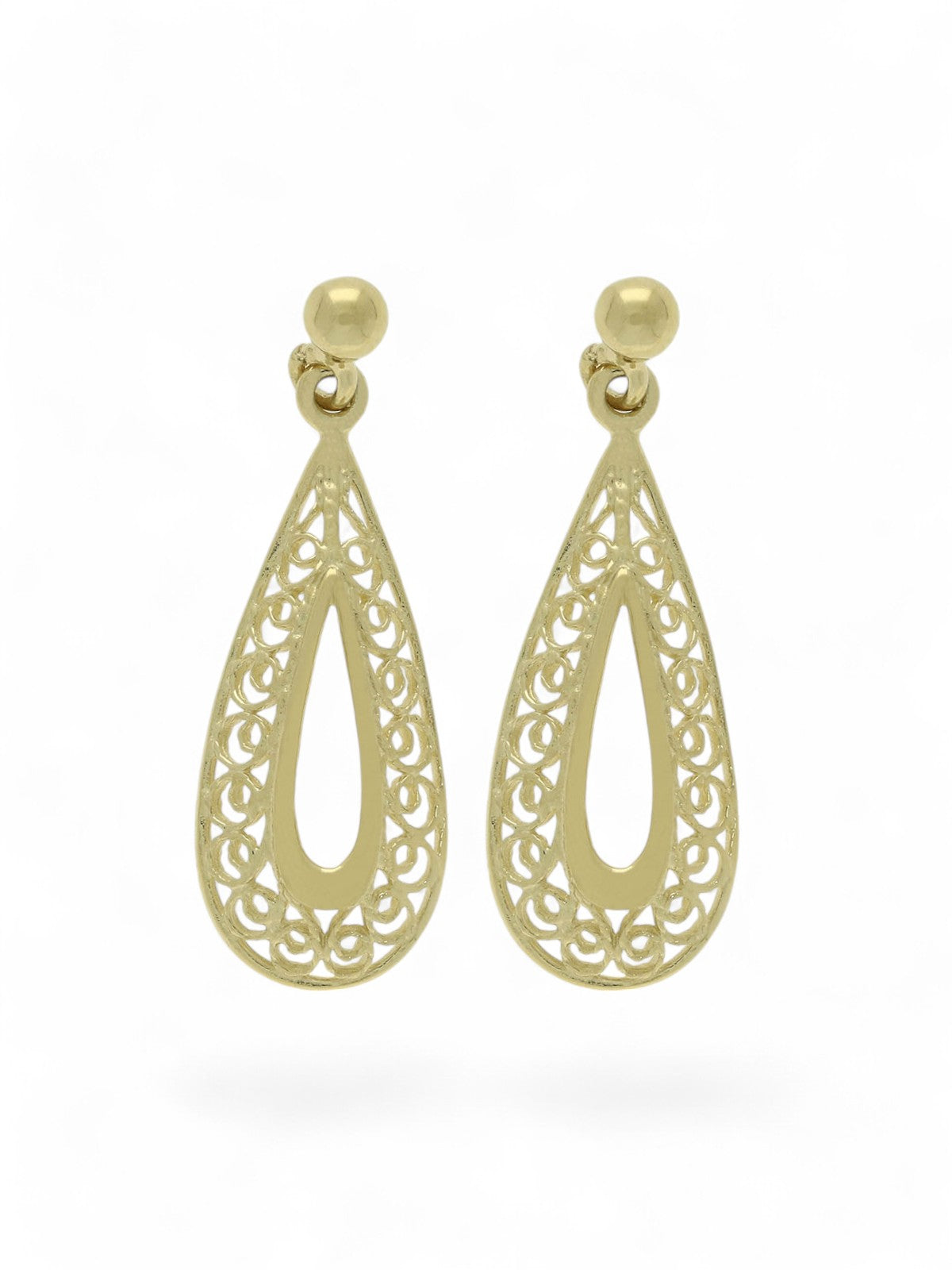 Open Filigree Pear Shaped Drop Earrings in 9ct Yellow Gold