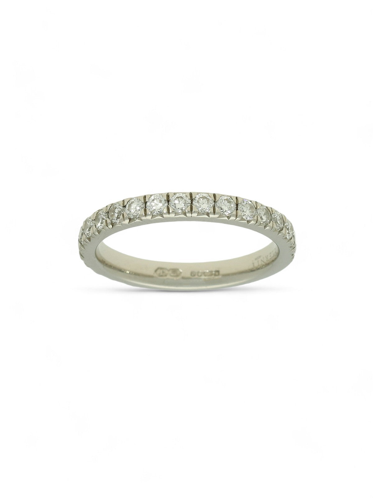 Available to buy online or at our jewellers in Eastbourne, East Sussex, this pre owned diamond eternity ring crafted from palladium, showcases a row of round brilliant cut diamonds in a grain setting, and measure a UK finger size H 1/2.