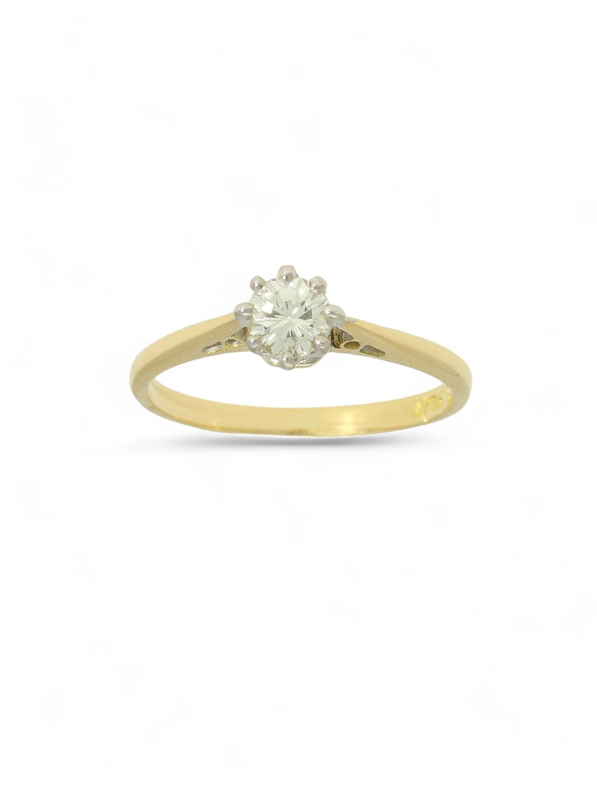 Available to buy online or at our Eastbourne, East Sussex jewellers, crafted from 18ct yellow gold and platinum, this pre owned diamond solitaire ring showcases a single round brilliant cut diamond (approx 0.30ct) in an eight claw setting.