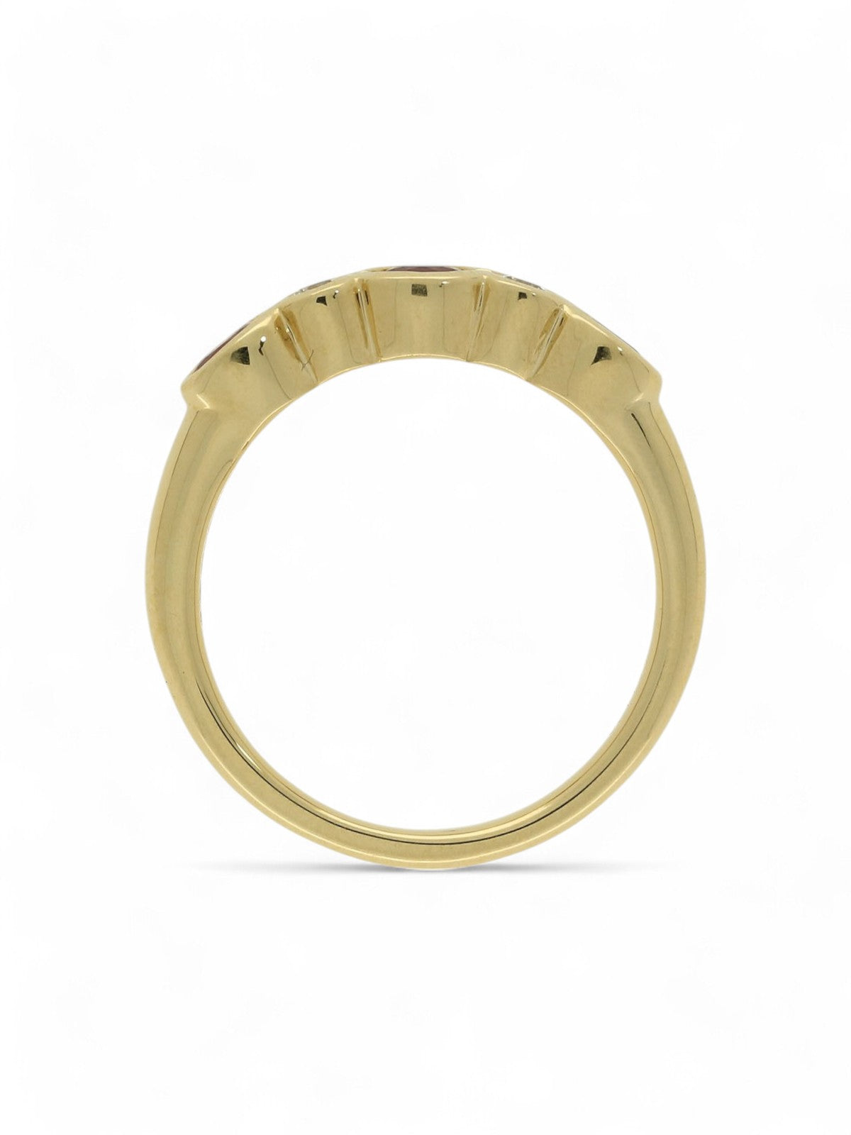 Lovingly crafted from 18ct yellow gold, this stunning half eternity ring showcases three oval cut ruby gemstones (total 0.68ct) and two round brilliant cut diamonds (total 0.11ct) in a rubover setting. Available to buy online or at our Eastbourne, East Sussex jewellers, this Ruby & Diamond Half Eternity Ring in 18ct Yellow Gold is a timeless way to celebrate one of life's special moments.