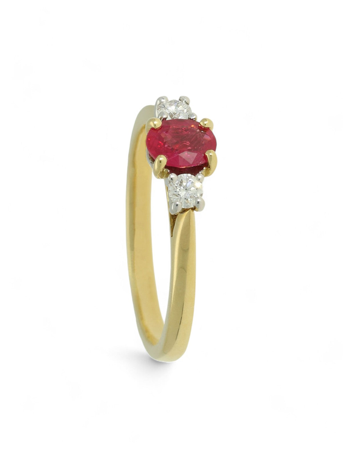Ruby & Diamond Round Brilliant Three Stone Ring in 18ct Yellow & White Gold