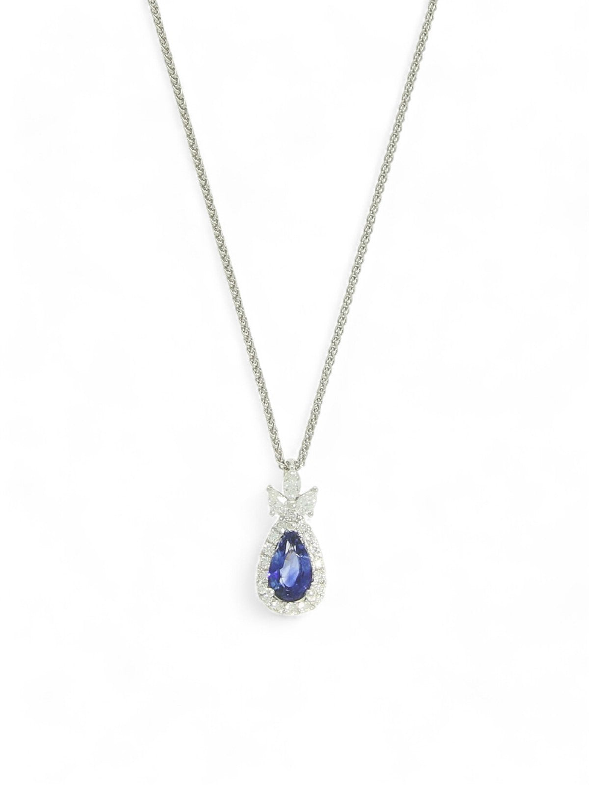 Sapphire & Diamond Pear Halo Pendant Necklace in 18ct White Gold