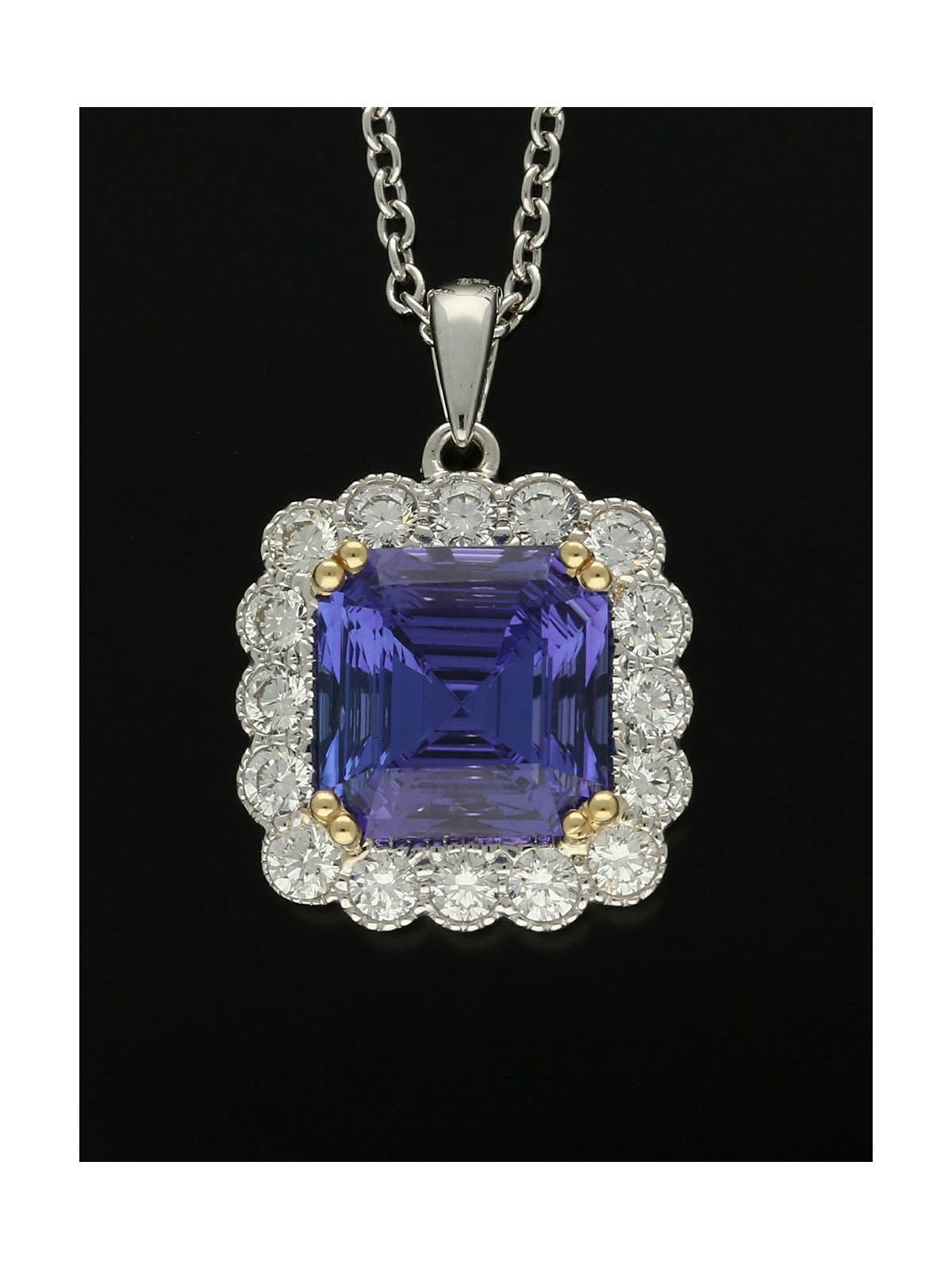 Beautifully crafted from 18ct yellow and white gold, this stunning pendant necklace showcases a single square step cut tanzanite gemstone which is framed by a cluster of sixteen round brilliant cut diamonds with a total weight of 0.18ct. The perfect gift for that special someone, this tanzanite and diamond pendant necklace is available to buy online or at our Eastbourne, East Sussex store.