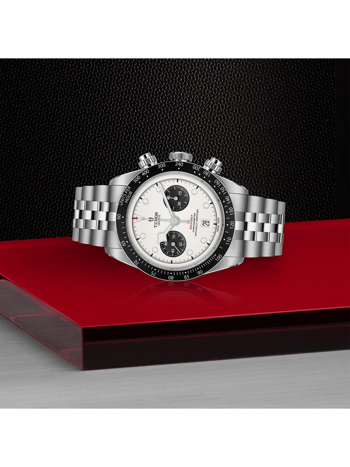 Showcasing a 41mm steel case, which houses an automatic movement, this TUDOR Black Bay Chrono is presented on a steel bracelet, and finished with an opaline dial.