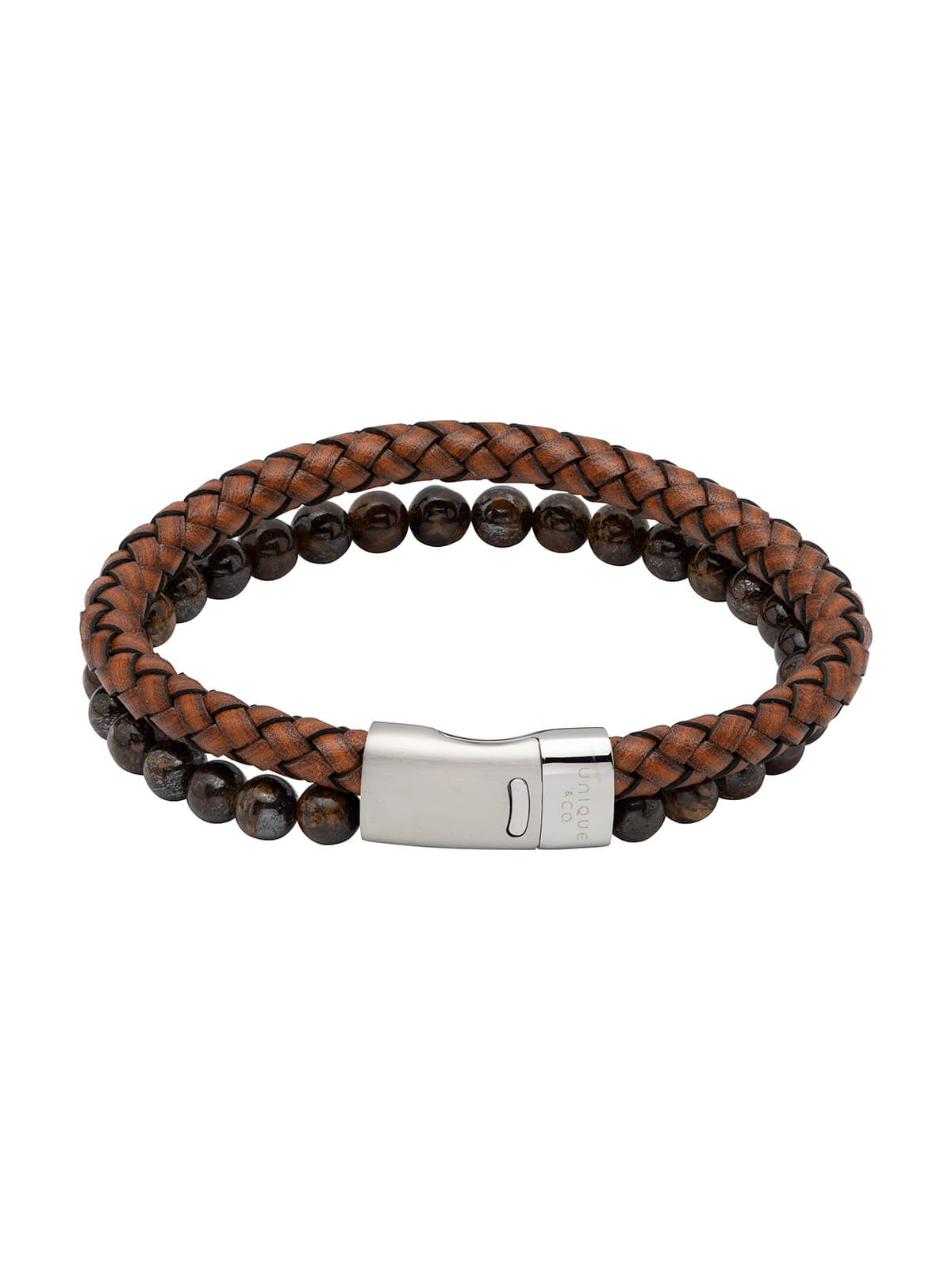 Unique & Co. 21cm Dark Brown Leather & Tiger's Eye Bead Bracelet with Steel Clasp