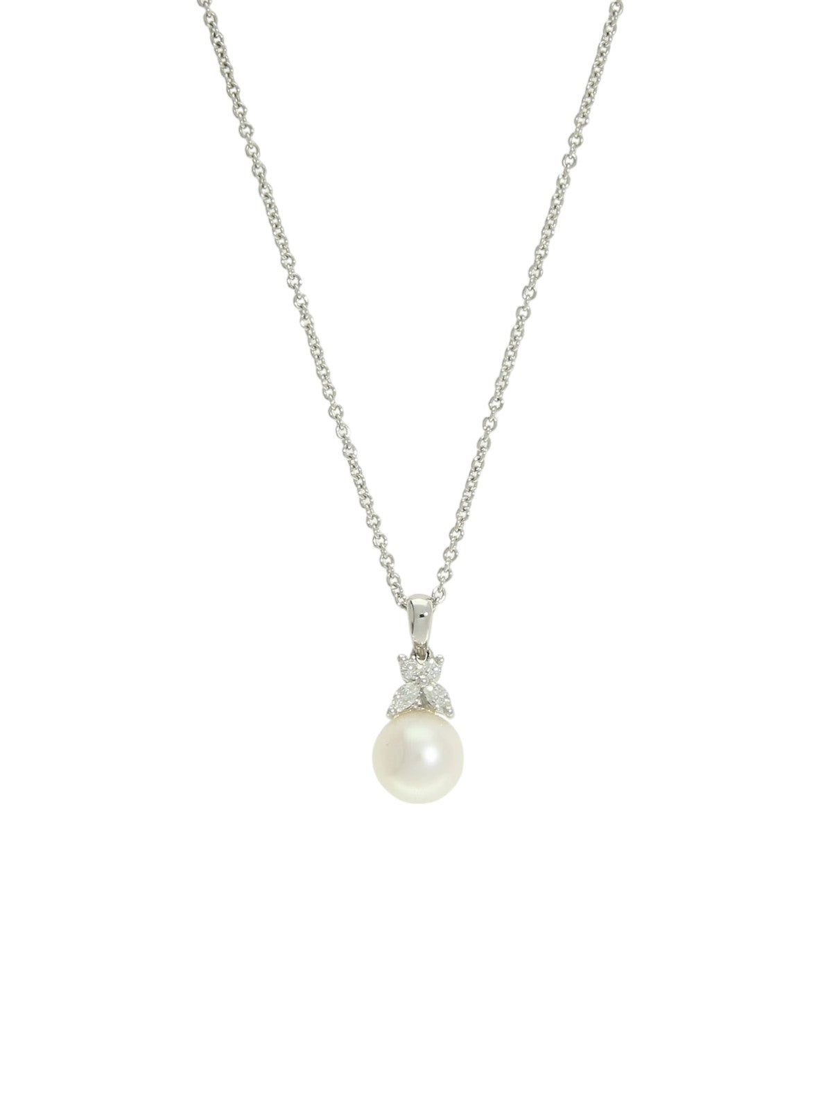 This beautiful pendant necklace is crafted 18ct White Gold and features a single white cultured pearl which is complemented by four diamonds weighing a total of 0.14ct.
