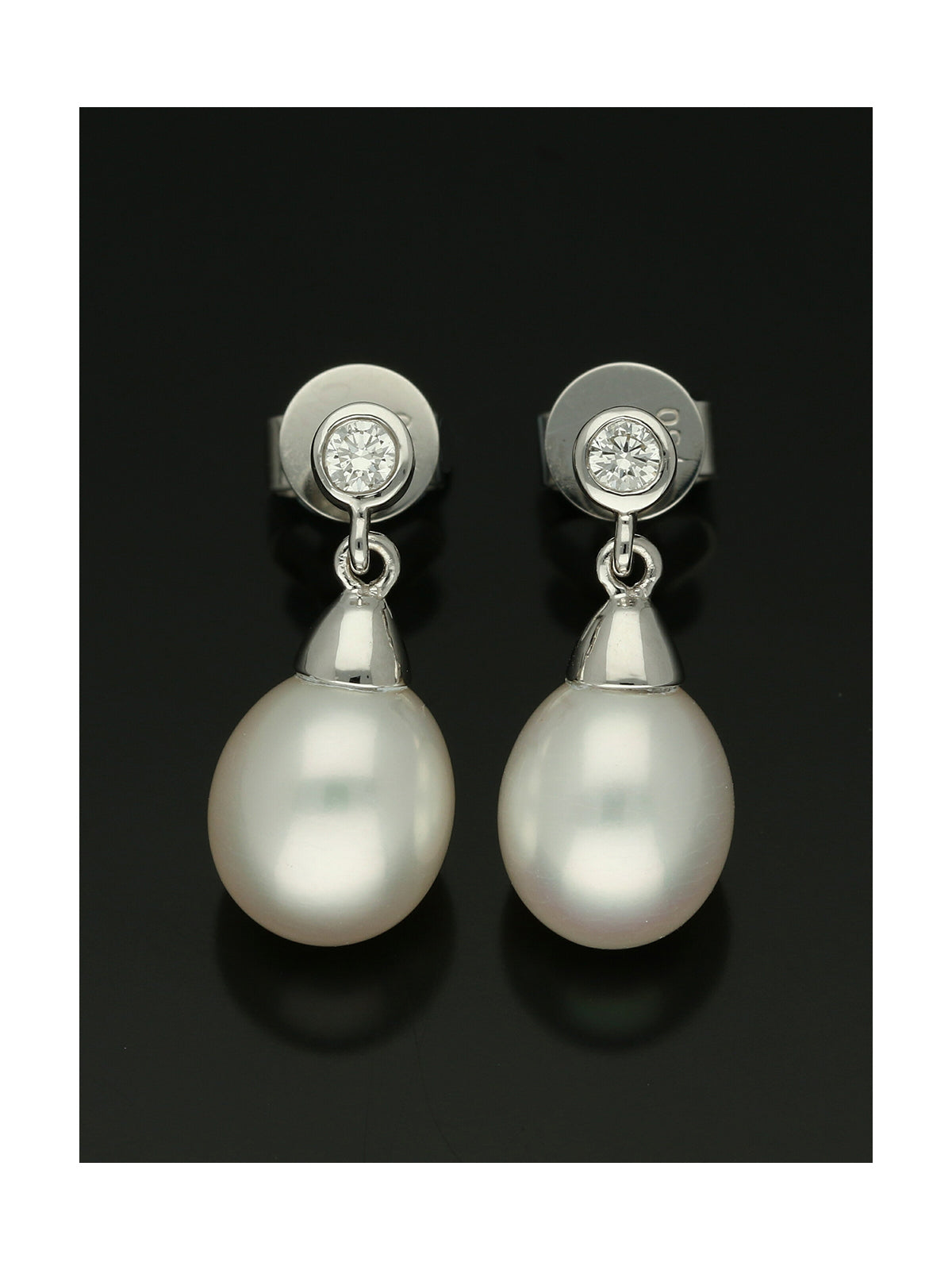 White Freshwater Pearl & Diamond Drop Earrings in 18ct White Gold